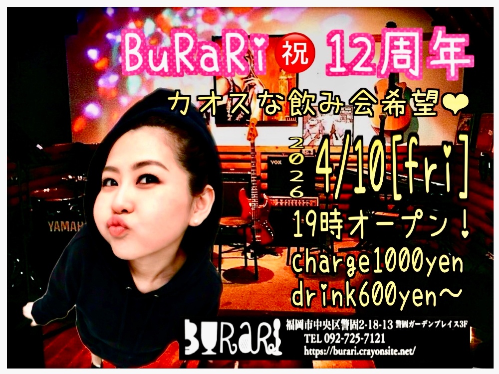 | 4月10日 金曜日 | BuRaRi 祝 12周年 19時オープン!! charge1000yen drink600yenより |