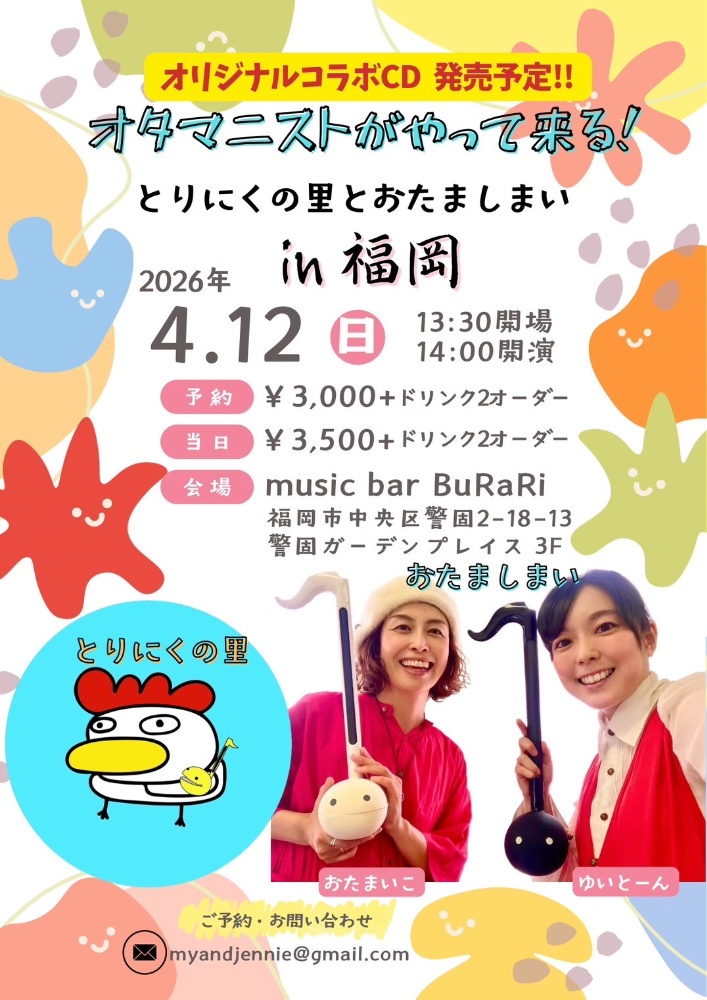 | 4月4日 土曜日 | うたうたいや 歌とお話 in 福岡 open18:00 start18:30 2000yen +2drink |