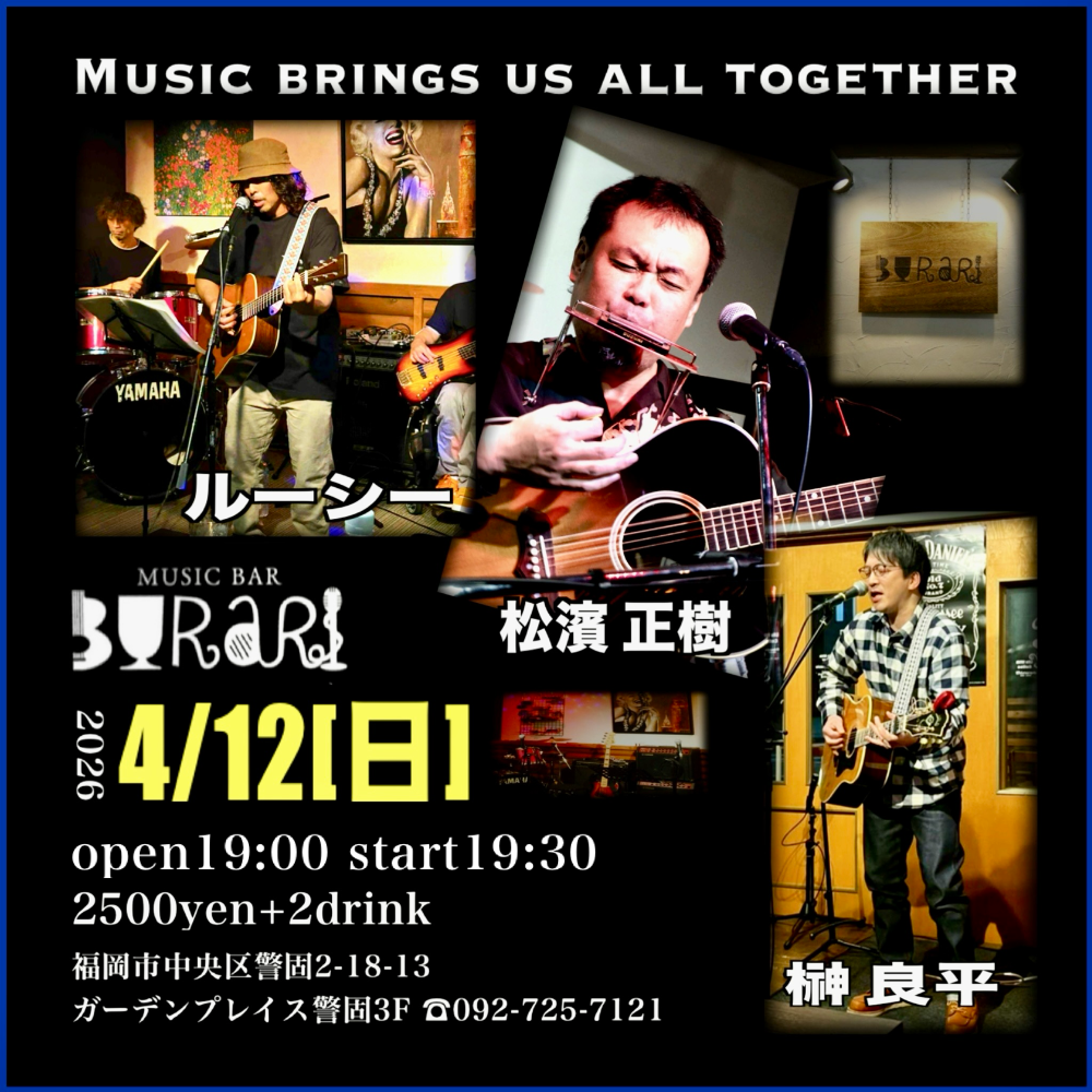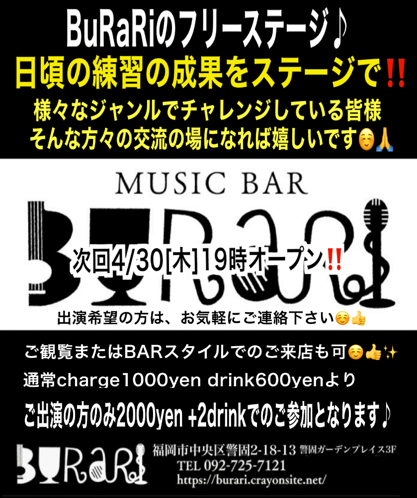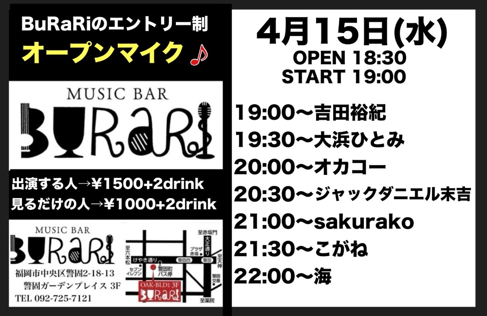 | 4月15日 水曜日 | NEW‼︎ BuRaRiのエントリー制 オープンマイク open18:30 start19:00 出演者:2000yen +2drink ご観覧:1000yen +2drink |