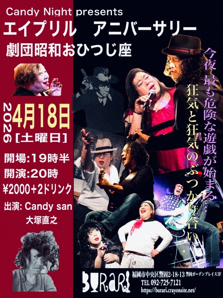 | 4月18日 土曜日 | Candy Night presents エイプリルアニバーサリー 劇団おひつじ座 出演:Candy san/大塚直之 open19:00 start20:00 2000yen+2drink |