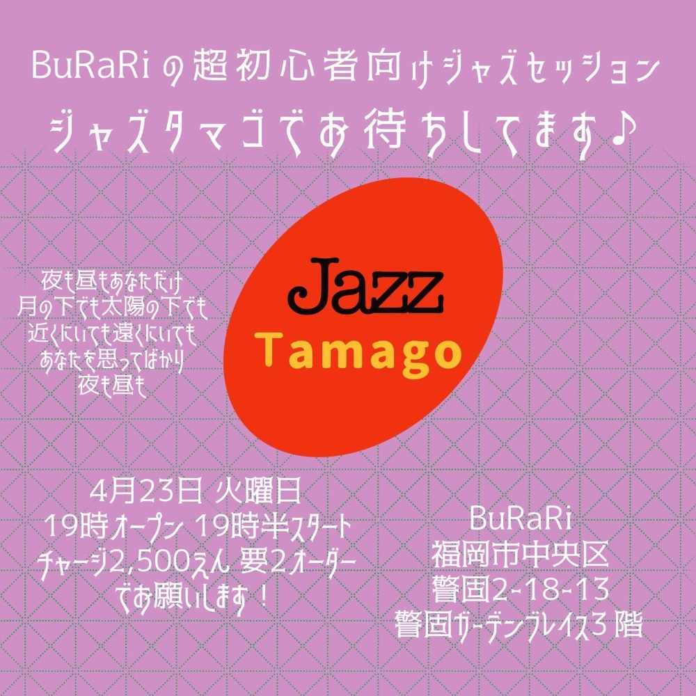 | 4月23日 木曜日 | BuRaRiの超初心者向けセッション ジャズタマゴ open19:00 start19:30 2500yen +2drink |
