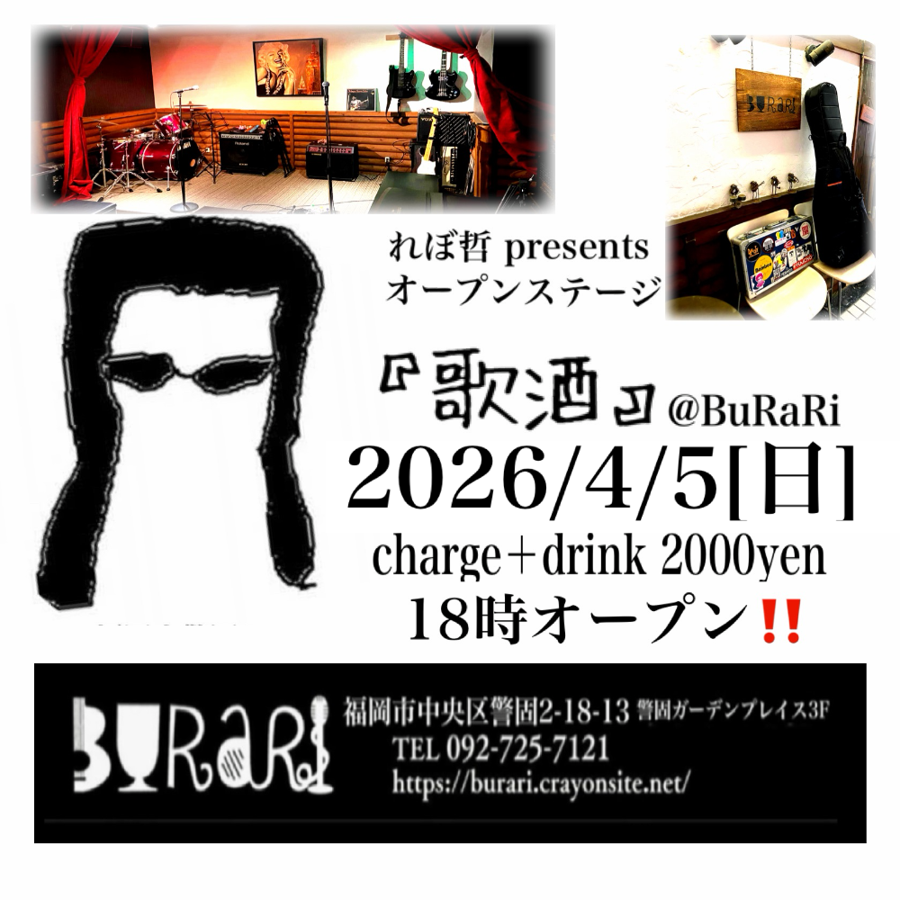 | 4月5日 日曜日 | れぼ哲presents 『歌酒』 18時オープン 2000yen(1drink込) ※キャッシュオンシステム ※食べ物のみ持ち込みOK |