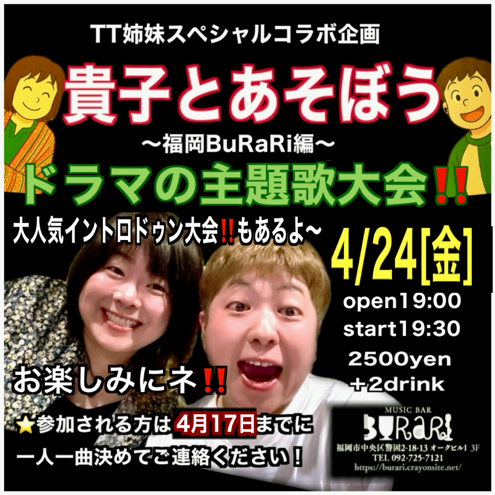 | 4月24日 金曜日 | TT姉妹スペシャルコラボ企画 『貴子とあそぼう』 福岡BuRaRi編 open19:00 start19:30 2500yen+2drink |