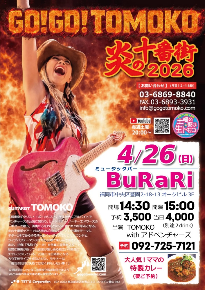 | 4月26日 日曜日 | GO!GO!TOMOKO 炎の10番街2026 open14:30 start15:00 予約3500yen +2drink 当日4000yen +2drink |