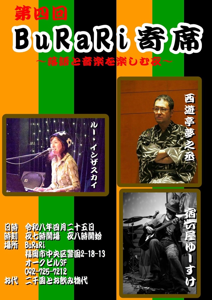 | 4月25日 土曜日 | 第四回 BuRaRi寄席 〜落語と音楽を楽しむ夜〜 open19:00 start20:00 2000yen +2drink |