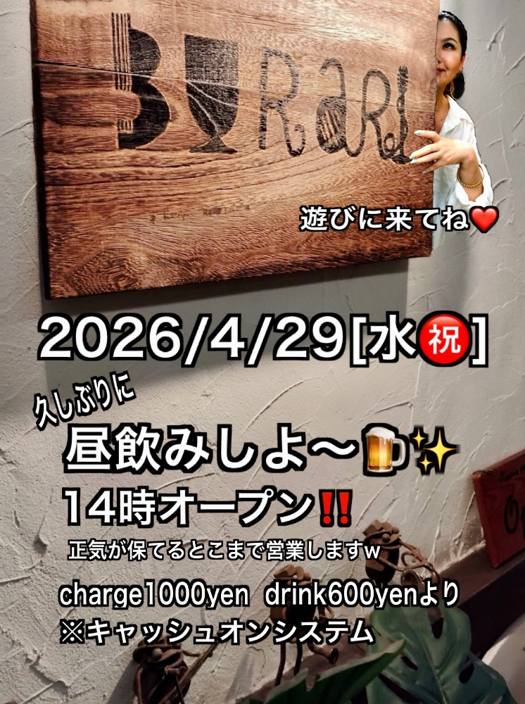 | 4月29日 水曜日 昭和の日 | 昼飲みBuRaRi♪ open14:00 charge1000yen drink600yenより |