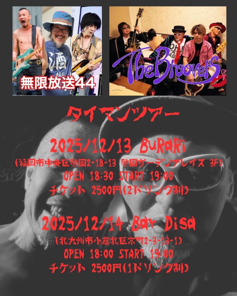 | 12月13日 土曜日 | 『タイマンツアー』 無限放送44 The Broovers open18:30 start19:00 2500yen+2drink |