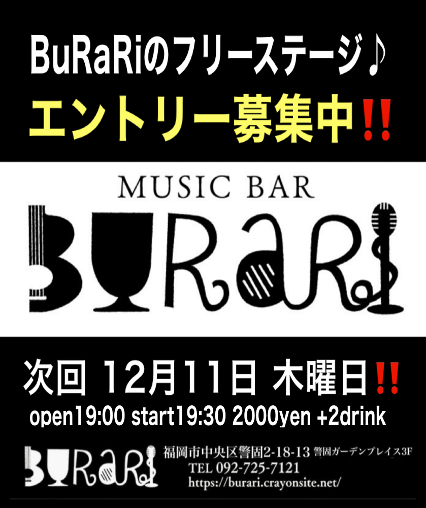 | 12月11日 木曜日 | 『BuRaRiフリーステージ』 open19:00 start19:30 2000yen +2drink |