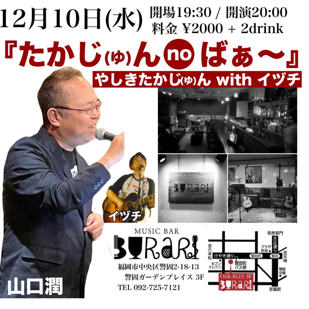 | 12月10日 水曜日 | 『たかじゅんnoばぁ〜』 やしきたかじゅんwithイヅチ open19:30 start20:00 2000yen+2drink |