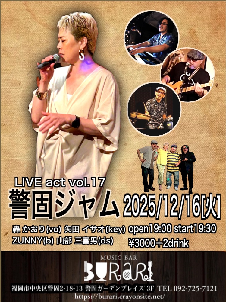| 12月16日 火曜日 | 『警固ジャム』 LIVE act vol.17 open19:00 start19:30 3000yen+2drink |