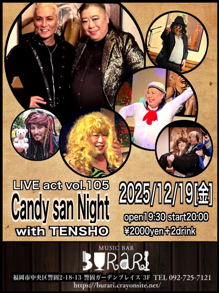 | 12月19日 金曜日 | Candy san Night with TENSHO open19:30 start20:00 2000yen+2drink |