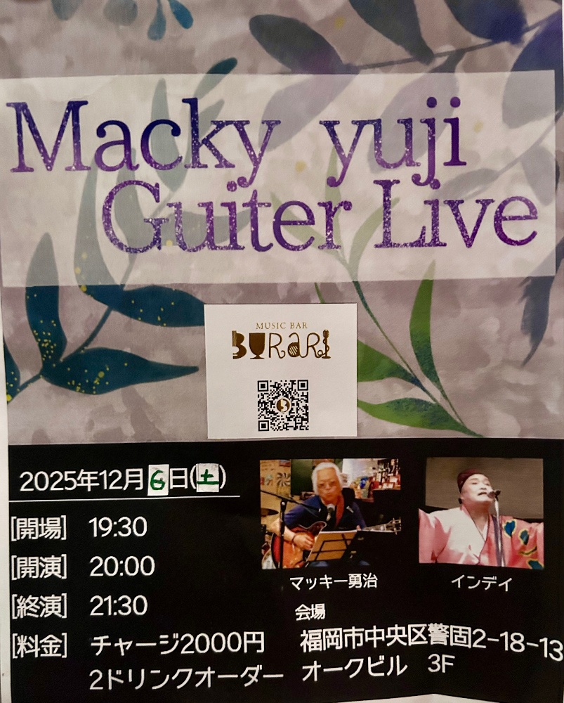 | 12月6日 土曜日 | 『Macky yuji Guiter Live』 マッキー勇治/インディ open19:30 start20:00 2000yen+2drink |