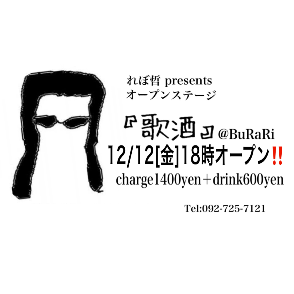 | 12月12日 金曜日 | れぼ哲presents 『歌酒』 2000yen(1drink込) ※キャッシュオンシステム ※食べ物のみ持ち込みOK |