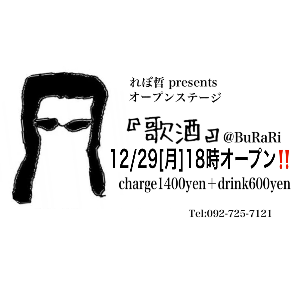 | 12月29日 月曜日 | れぼ哲presents 『歌酒』 2000yen(1drink込) ※キャッシュオンシステム ※食べ物のみ持ち込みOK |