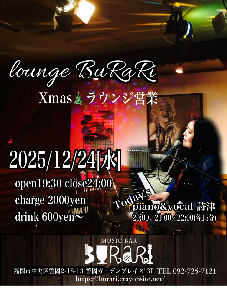 | 12月24日 水曜日 | 『音楽ラウンジXmas営業』 詩津 ※ピアノ弾き語り 演奏(各15分) 20:00〜 21:00〜 22:00〜 open19:30 close24:00 charge2000yen drink600yenより |