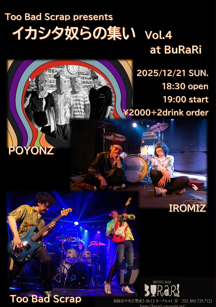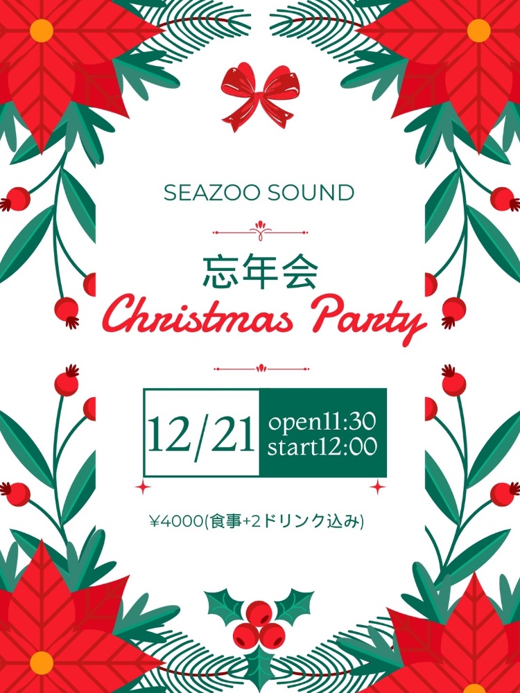 | 12月21日 日曜日 | SEAZOO SOUND 忘年会&Xmas party open11:30 start12:00 4000yen (食事+2drink込み) / Too Bad Scrap presents イカした奴らの集いvol.4 POYONZ IROMIZ Too Bad Scrap open18:30 start19:00 2000yen+2drink |
