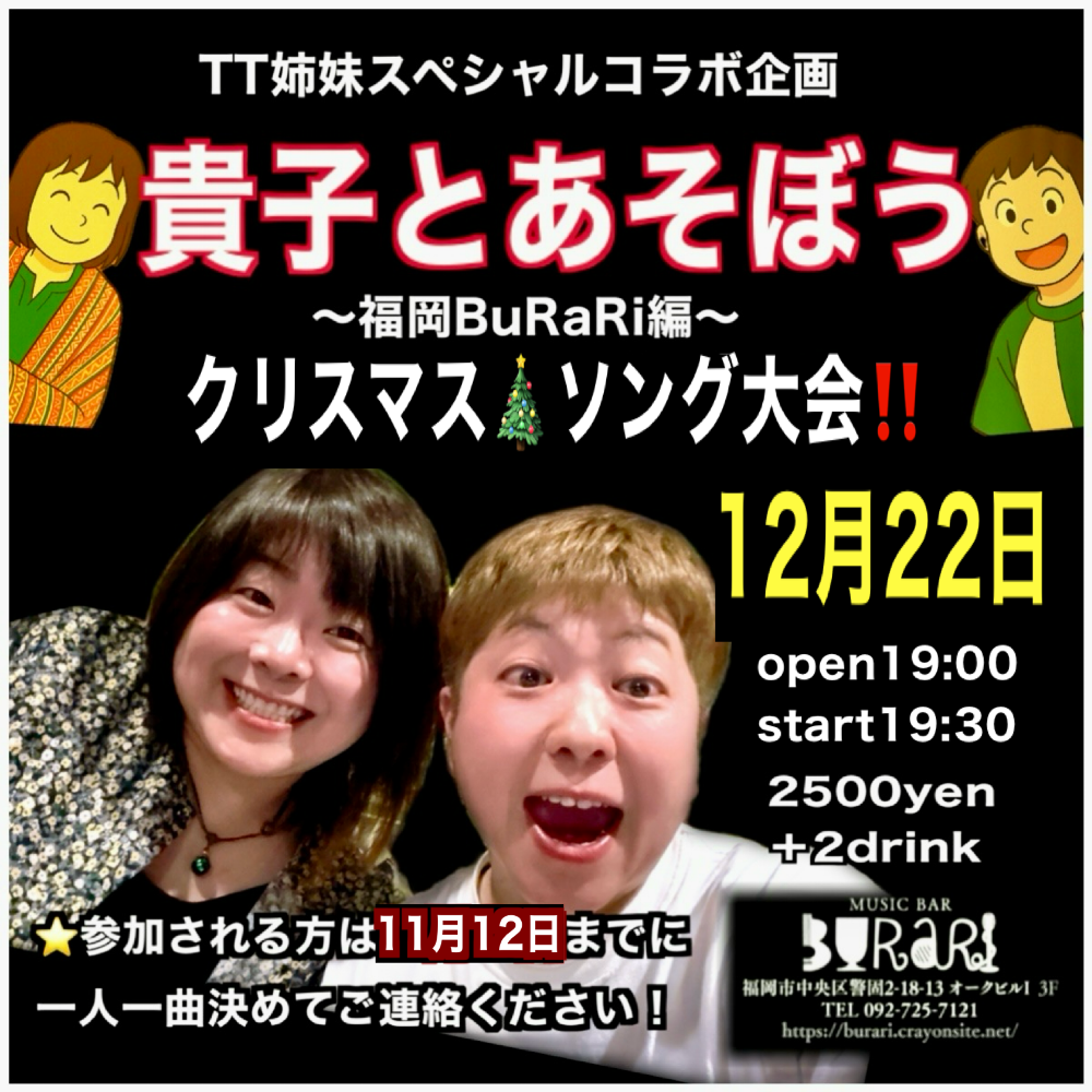 | 12月22日 月曜日 | TT姉妹スペシャルコラボ企画 『貴子とあそぼう』 福岡BuRaRi編 open19:00 start19:30 2500yen+2drink |