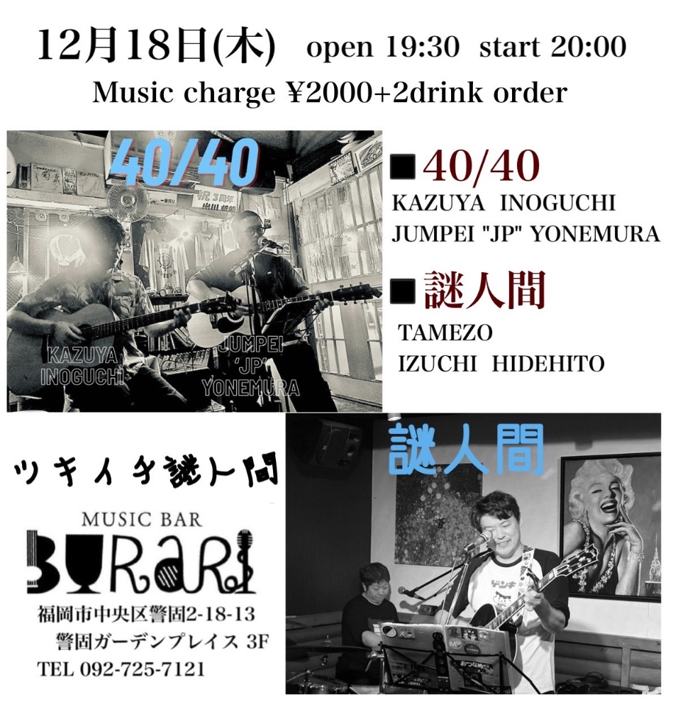 | 12月18日 木曜日 | 『ツキイチ謎人間』 40/40/謎人間 open19:30 start20:00 2000yen +2drink |