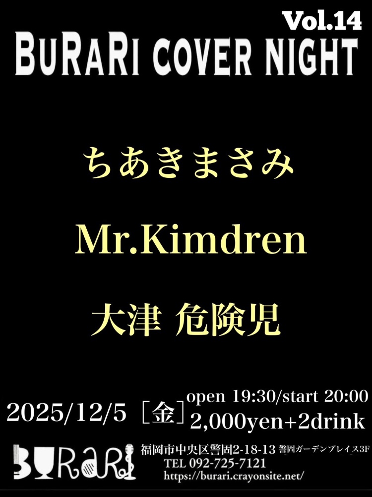 | 12月5日 金曜日 | 『BuRaRi cover night』 ちあきまさみ Mr.Kimdren 大津 危険児 open19:30 start20:00 2000yen+2drink |