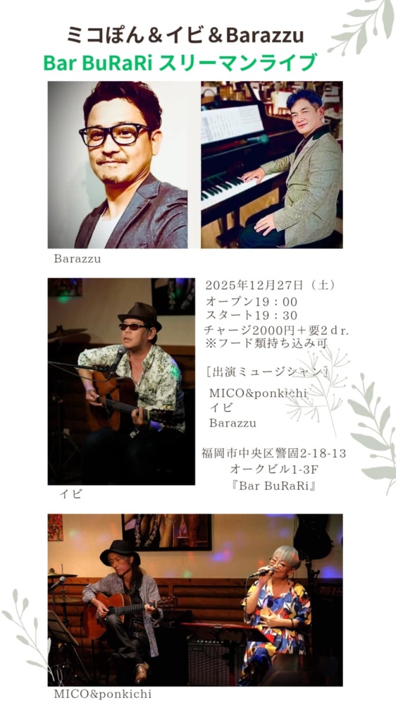 | 12月27日 土曜日 | ミコぽん&イビ&Barazzu スリーマンライブ open19:00 start19:30 2000yen+2drink |