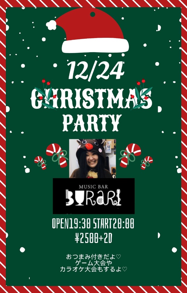 | 12月24日 水曜日 | 詩津と一緒に過ごそ 『Christmas party』 open19:30 start20:00 charge2500yen 詩津の美味しいおつまみ付き♡ カラオケ大会 ゲーム大会etc |