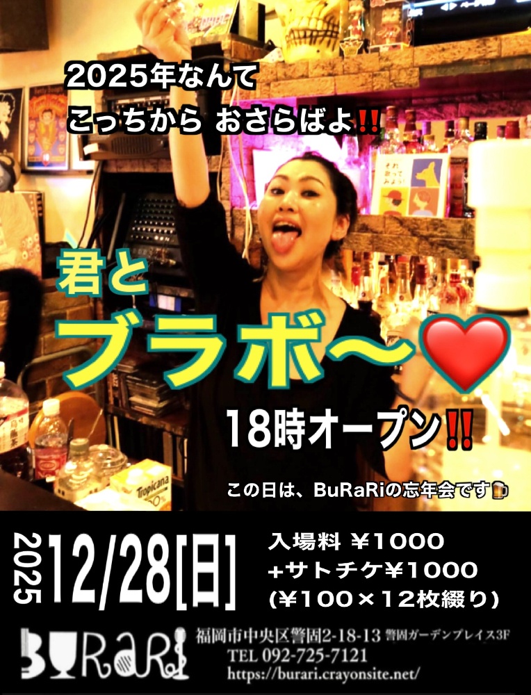 | 12月11日 木曜日 | 『BuRaRiフリーステージ』 エントリー募集中!!!! なんでもありのフリーステージ♪ 日頃の成果に新たな挑戦 お気軽に披露しに来て下さい!!!! open19:00 start19:30 2000yen +2drink |
