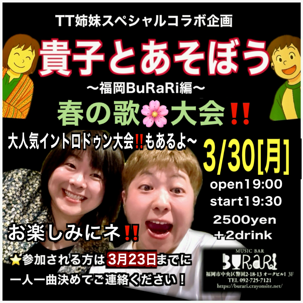 | 3月30日 月曜日 | TT姉妹スペシャルコラボ企画 『貴子とあそぼう』 福岡BuRaRi編 open19:00 start19:30 2500yen+2drink |