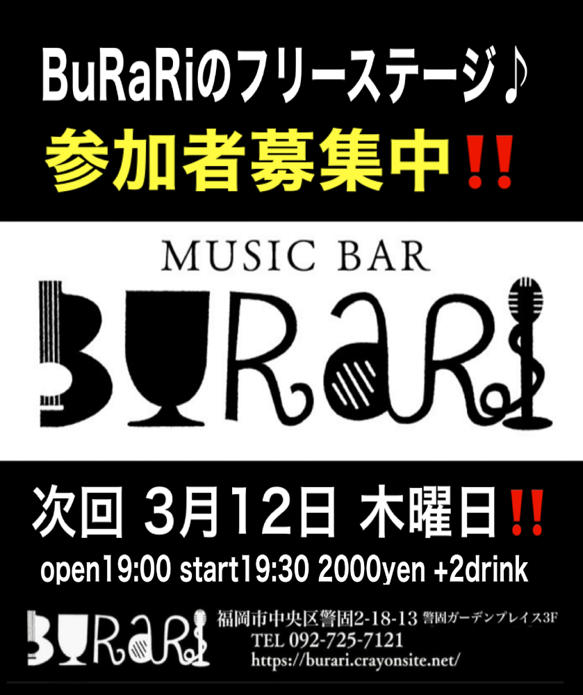 | 3月12日 木曜日 | 『BuRaRiフリーステージ』 エントリー募集中!!!! なんでもありのフリーステージ♪ 日頃の成果に新たな挑戦 お気軽に披露しに来て下さい!!!! open19:00 start19:30 2000yen +2drink |