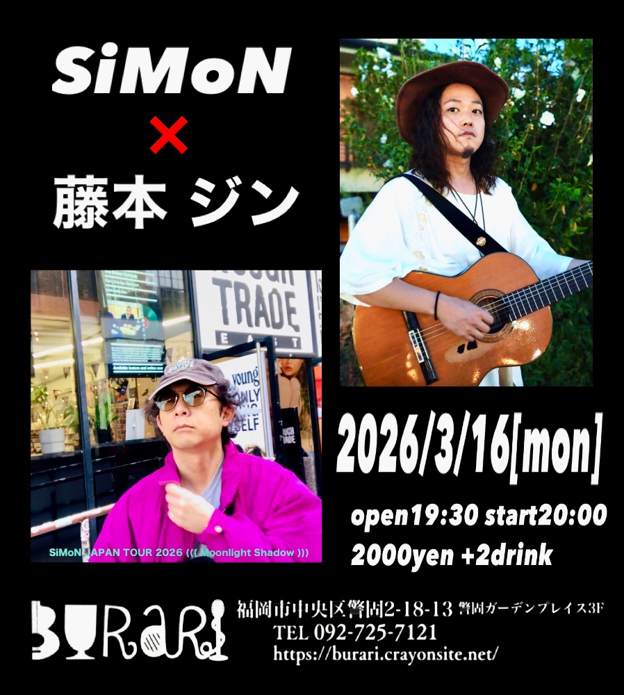 | 3月16日 月曜日 | SiMon 藤本ジン open19:30 start20:00 2000yen+2drink |