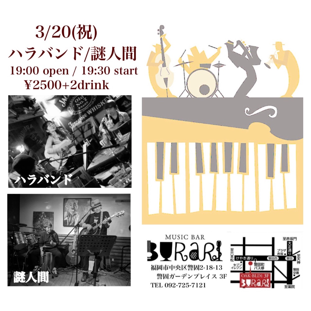 | 3月20日 金曜日 | 謎人間 ハラバンド open19:00 start19:30 2500yen+2drink |