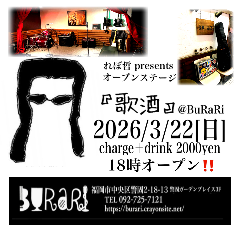 | 3月22日 日曜日 | れぼ哲presents 『歌酒』 open18:00 close24:00 2000yen(1drink込) ※キャッシュオンシステム ※食べ物のみ持ち込みOK |
