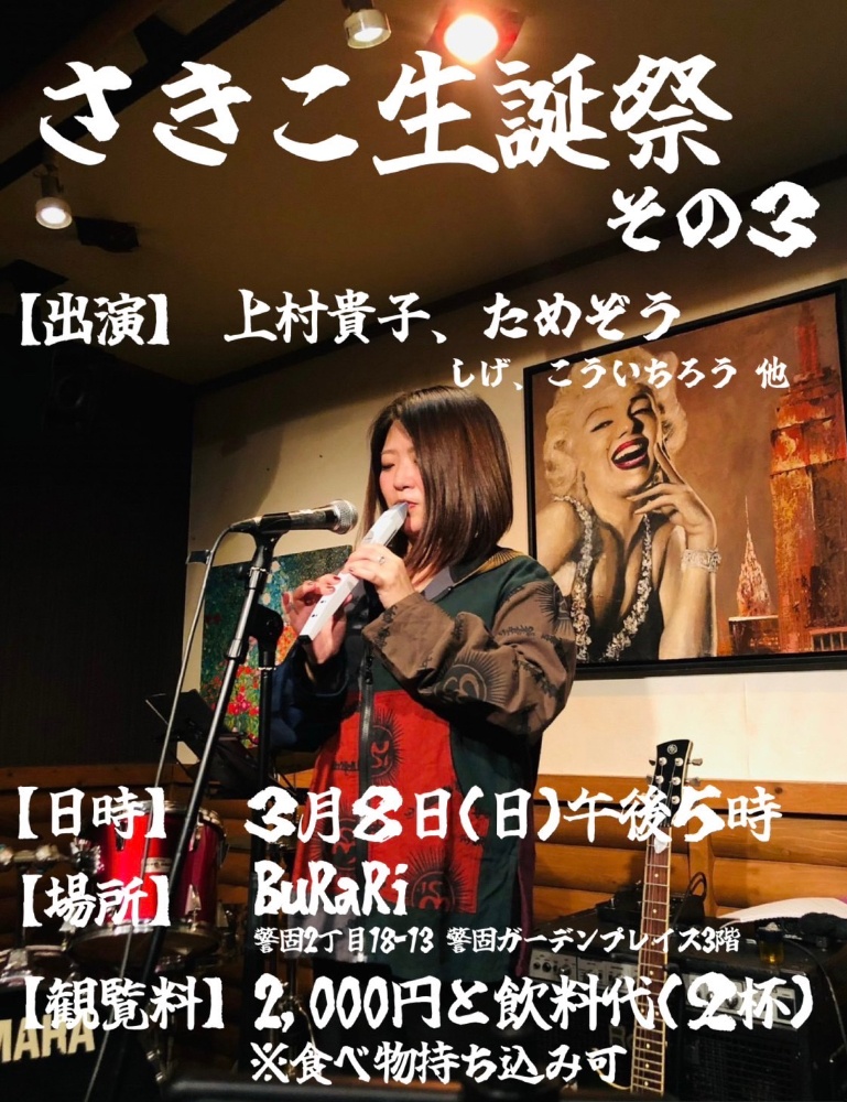 | 3月5日 木曜日 | 『歌声喫茶』in BuRaRi 参加費:¥1800+1ドリンク カレー&おつまみ販売あり 19時スタート! |