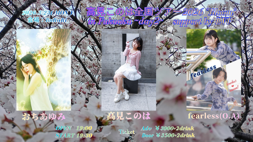 | 3月23日 月曜日 | 高見このは全国ツアー"Bloom" in FUKUOKA day2 supported by LVP open19:00 start19:30 前売3000yen+2drink 当日3500yen+2drink |