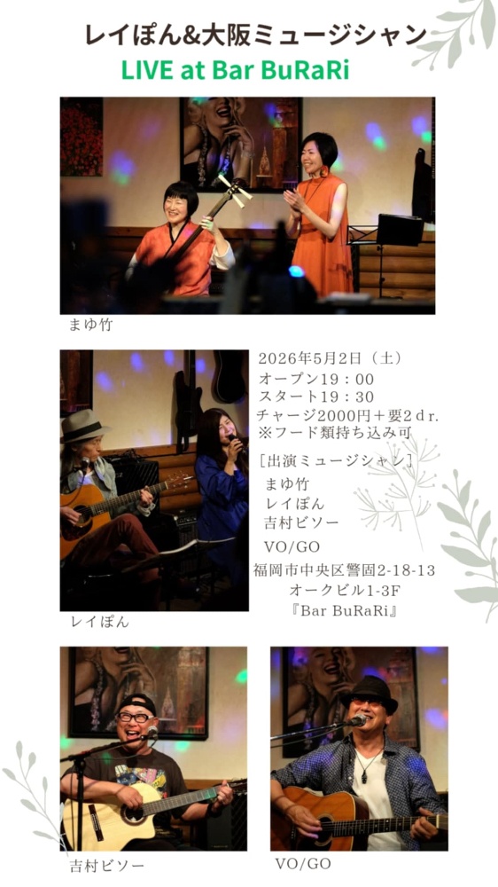 | 5月26日 火曜日 | 貴子とあそぼう 福岡BuRaRi編 open19:00 start19:30 2500yen+2drink |