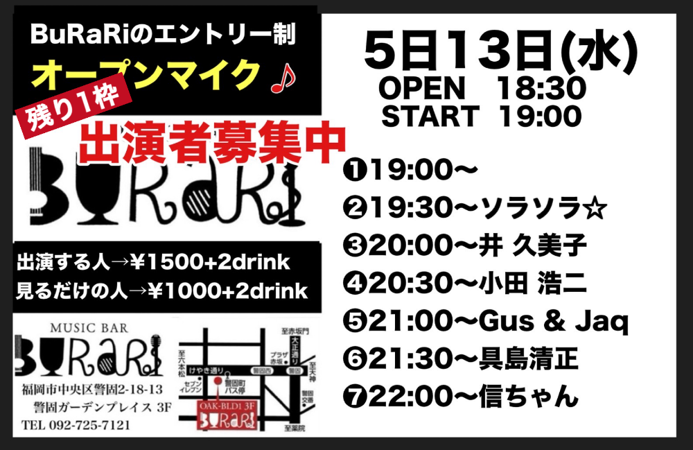 | 5月13日 水曜日 | BuRaRi オープンマイク |