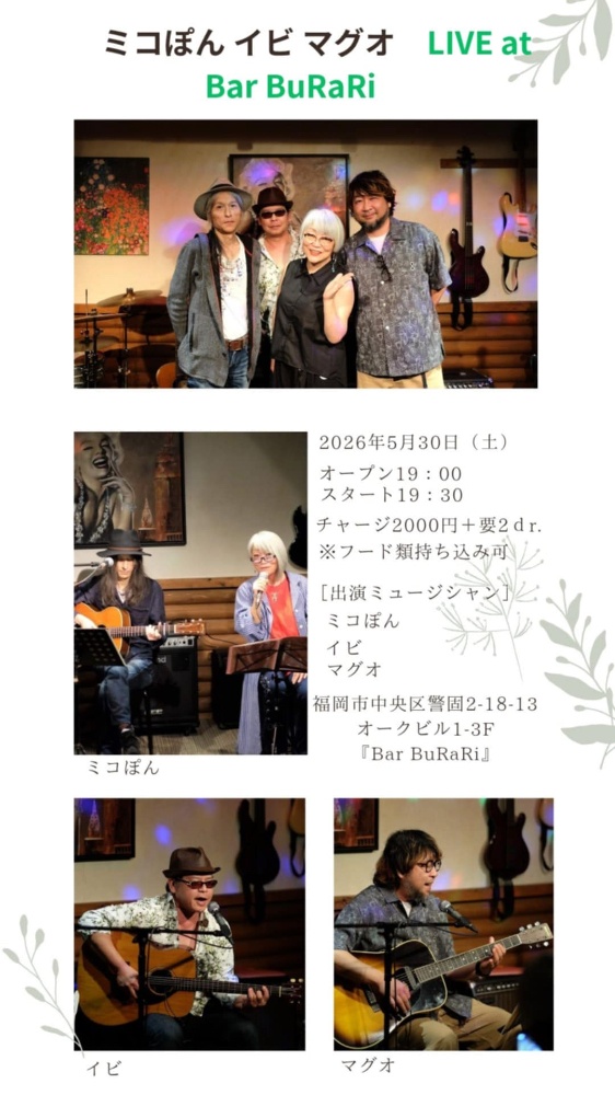 | 5月30日 土曜日 | スリーマンライブ ミコぽん イビ マグオ open19:00 start19:30 2000yen +2drink |
